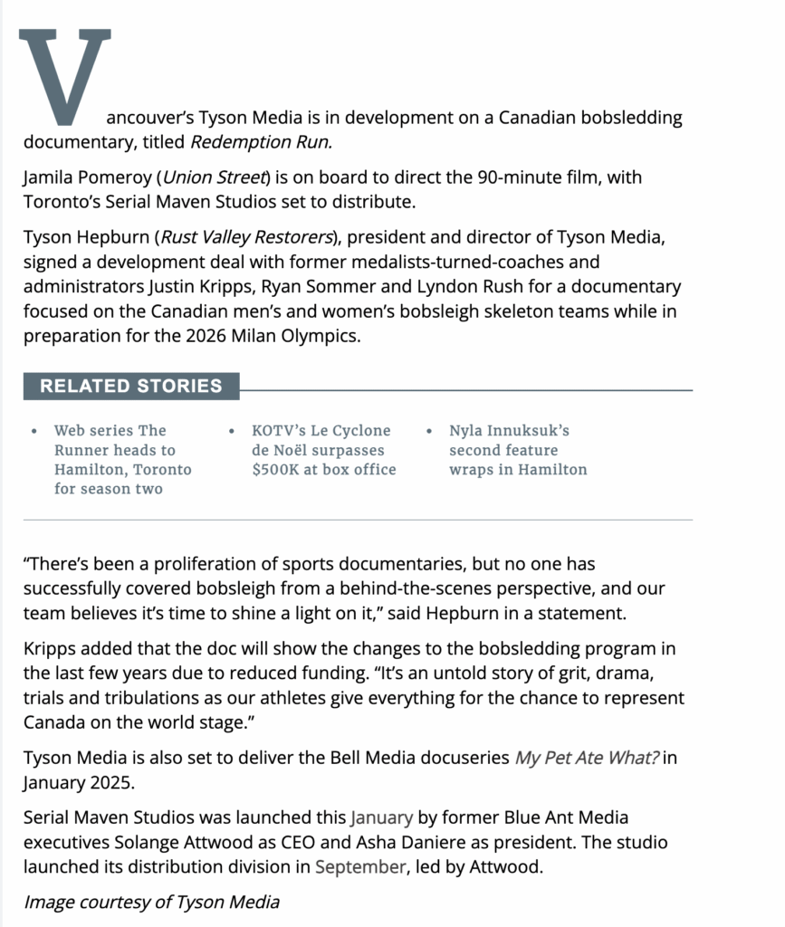 CBC acquires rights to Tyson Media’s bobsledding docuseries